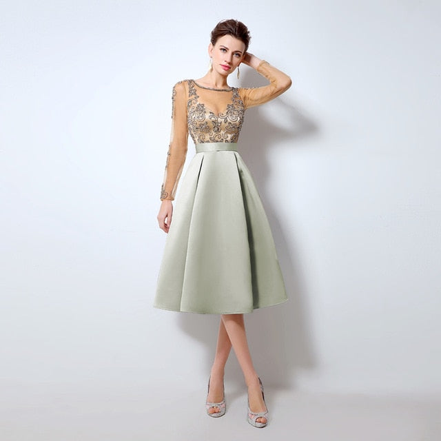 Champagne Cocktail Dresses with Long Sleeves hot Knee Length Short Satin Vestidos Plus Size Sexy Women Party Evening Gown LX015